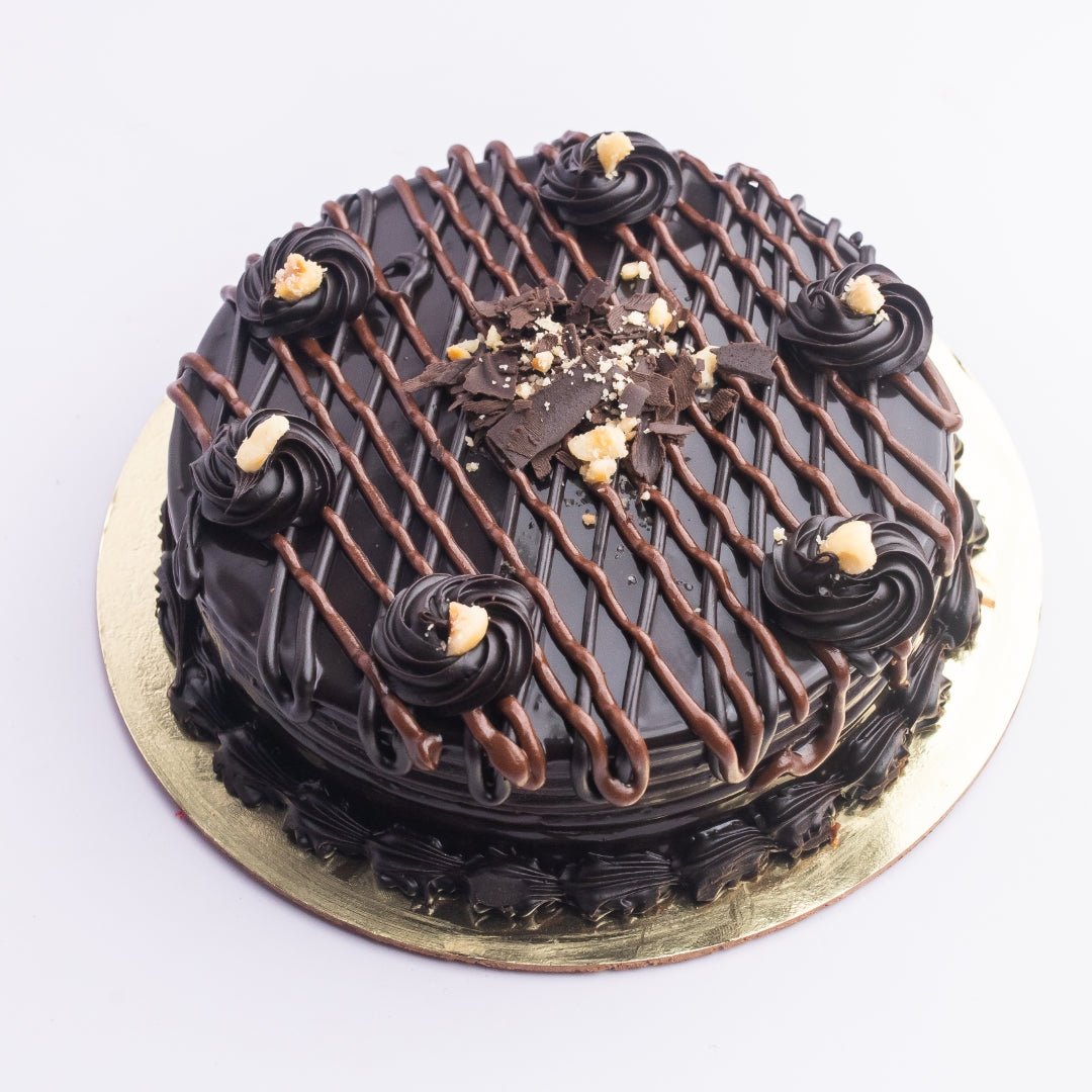 Dense chocolate gateau smothered with dark chocolate ganache. Decadent chocolate cake smeared with a thick layer of chocolate icing. Studded with chopped hazelnuts, our Belgian Hazelnut cake is a crunchy crumb that will tranquil your taste buds.