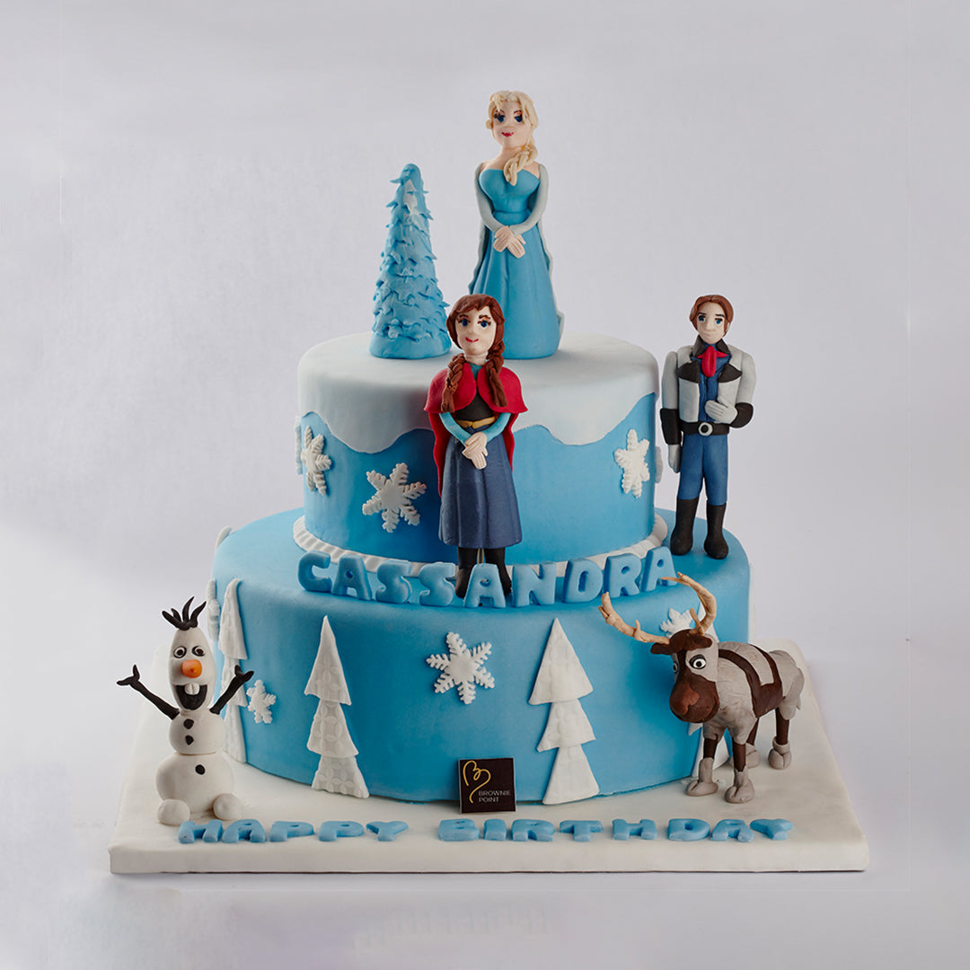 Two tier fondant cake. Decorated with finely crafted fondant statues of frozen characters this is a blue bliss that every child will relish! Available in multiple flavors, this theme cake is a dream come true for every little princess.