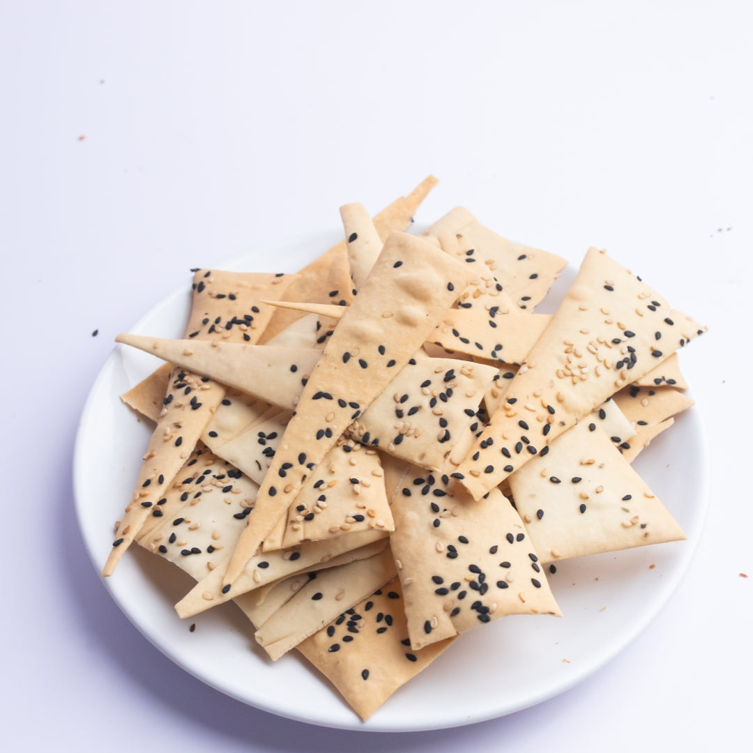 Whole wheat bread crackers garnished with sesame seeds. Crispy and snappy our sesame lavache can be served as chips or chai time side snacks. The authentic flavour and devouring texture makes this dish one of our classics.